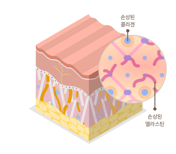 시간이 지나면서 서서히 콜라겐과 엘라스틴 및 피부 세포가 감소하면서 엘라스틴은 콜라겐과 콜라겐을 묶는 작은 뼈대 역할을 하기 때문에 엘라스틴과 콜라겐이 감소하게 되면 그 뼈대가 느슨해지고 피부 처짐 및 주름 등의 피부 노화가 시작됩니다.
